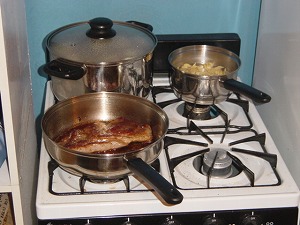 豚を焼いたのと、パスタ入りスープ(東欧風)
